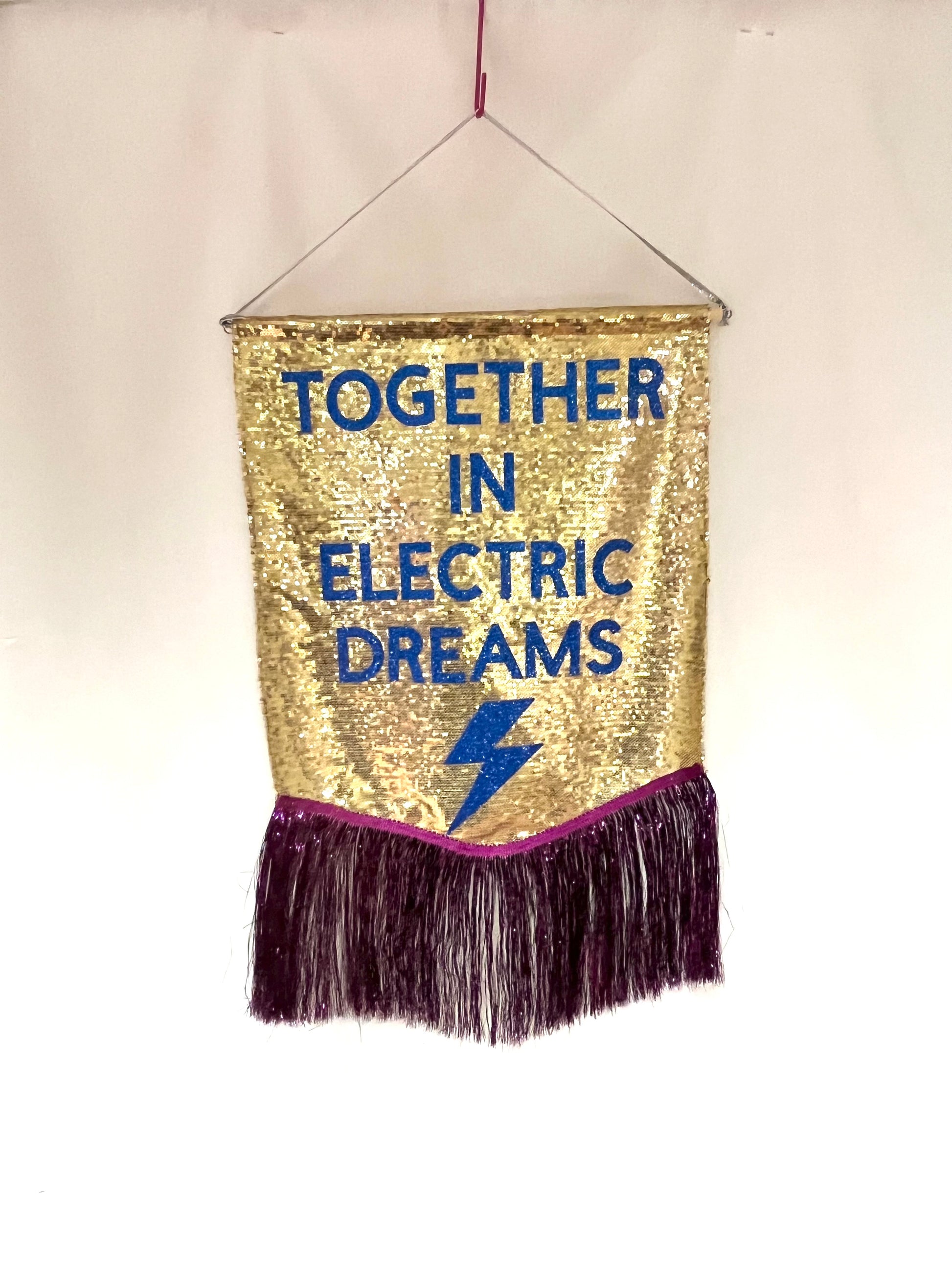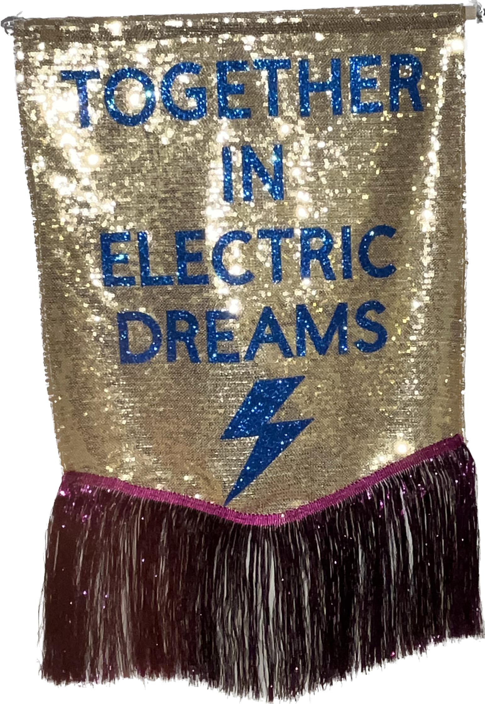 Dense golden sequins with fine glitter, electric blue writing and trimmed with purple tinsel