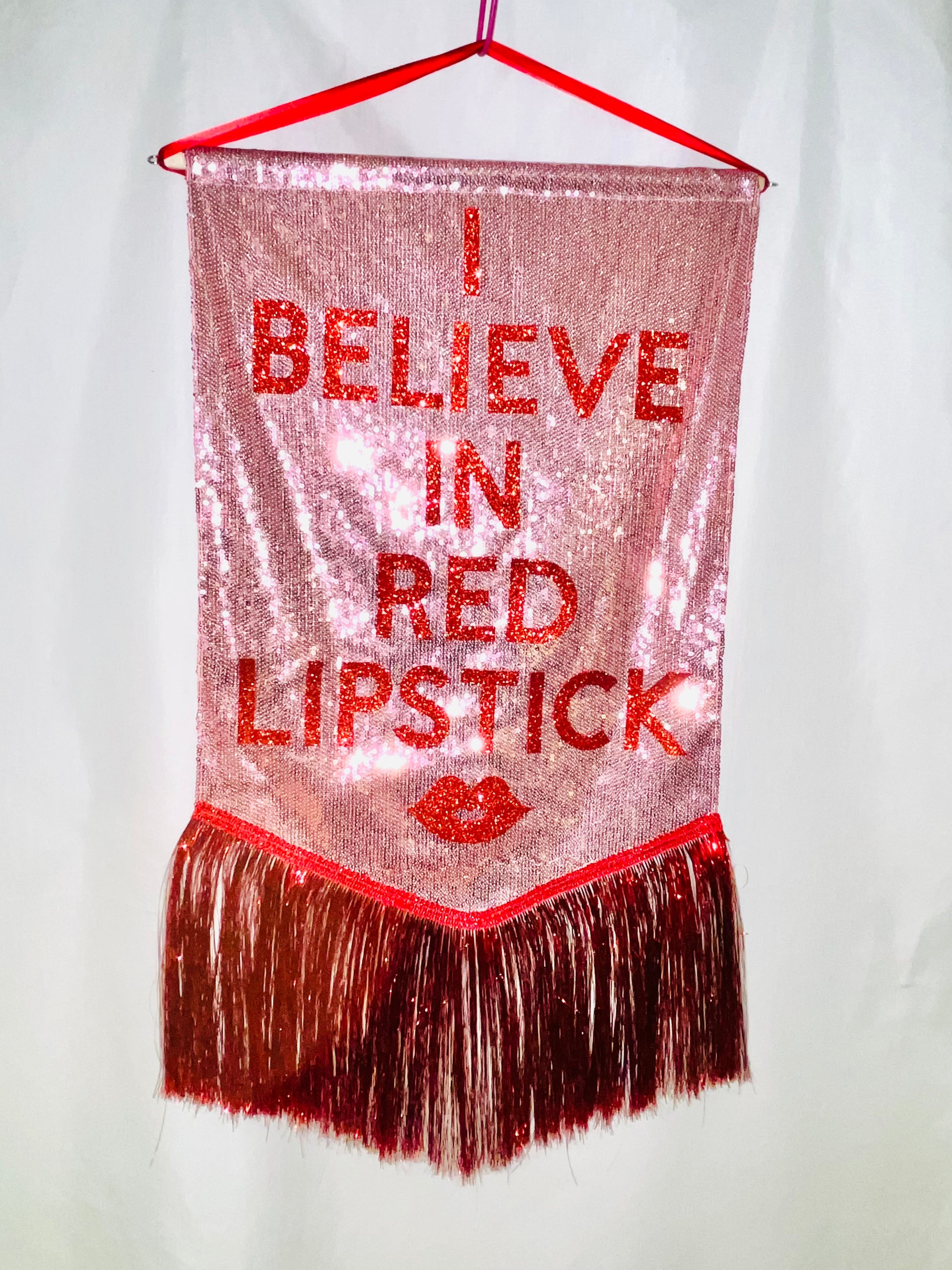 Dense pink sequins with fine glitter red writing and trimmed with matching red tinsel
