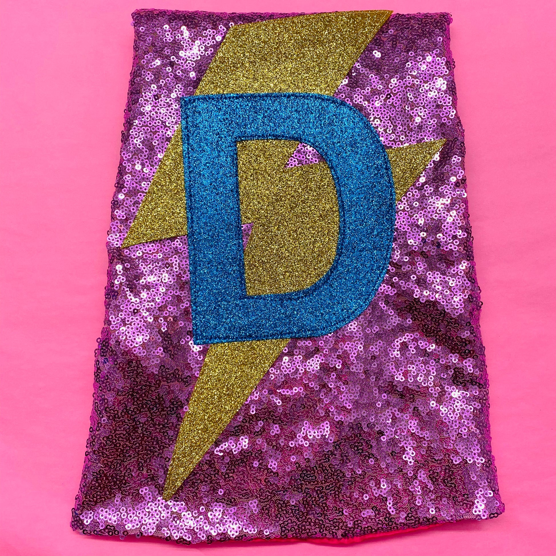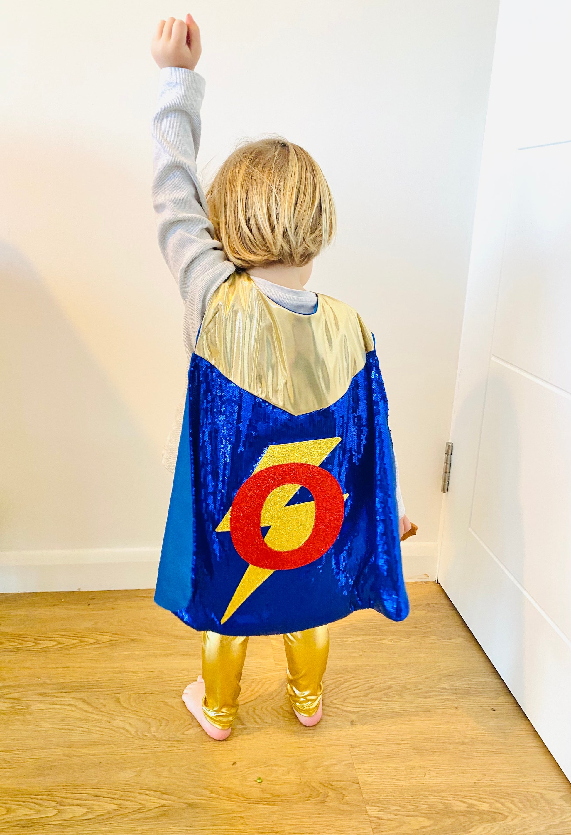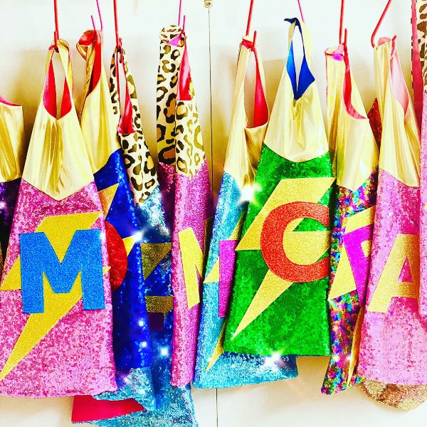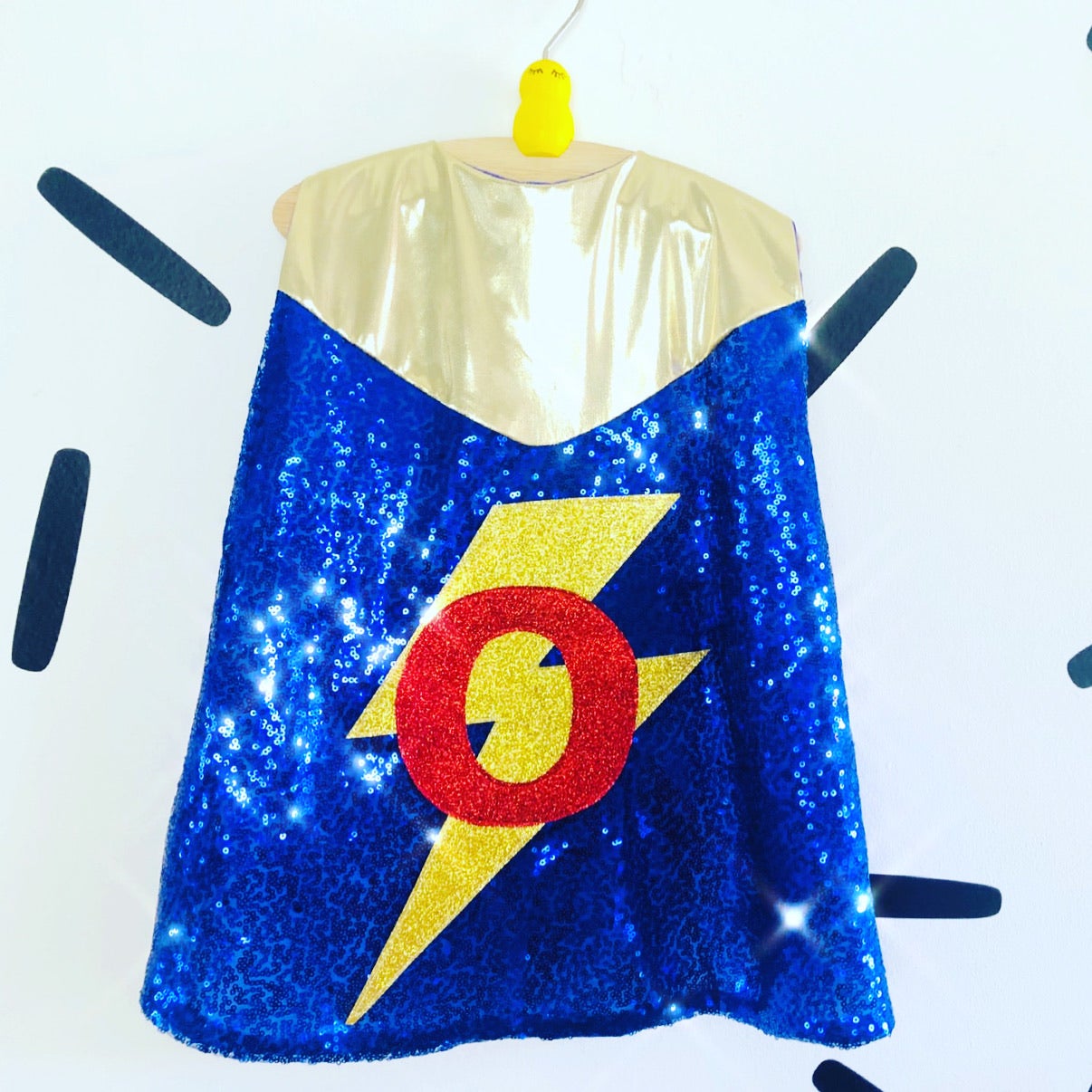 Our best selling customised cape, small, sparkly & mighty! Glistening sequins in your choice of colour, glitter lightening bolt & a stunningly sparkly initial