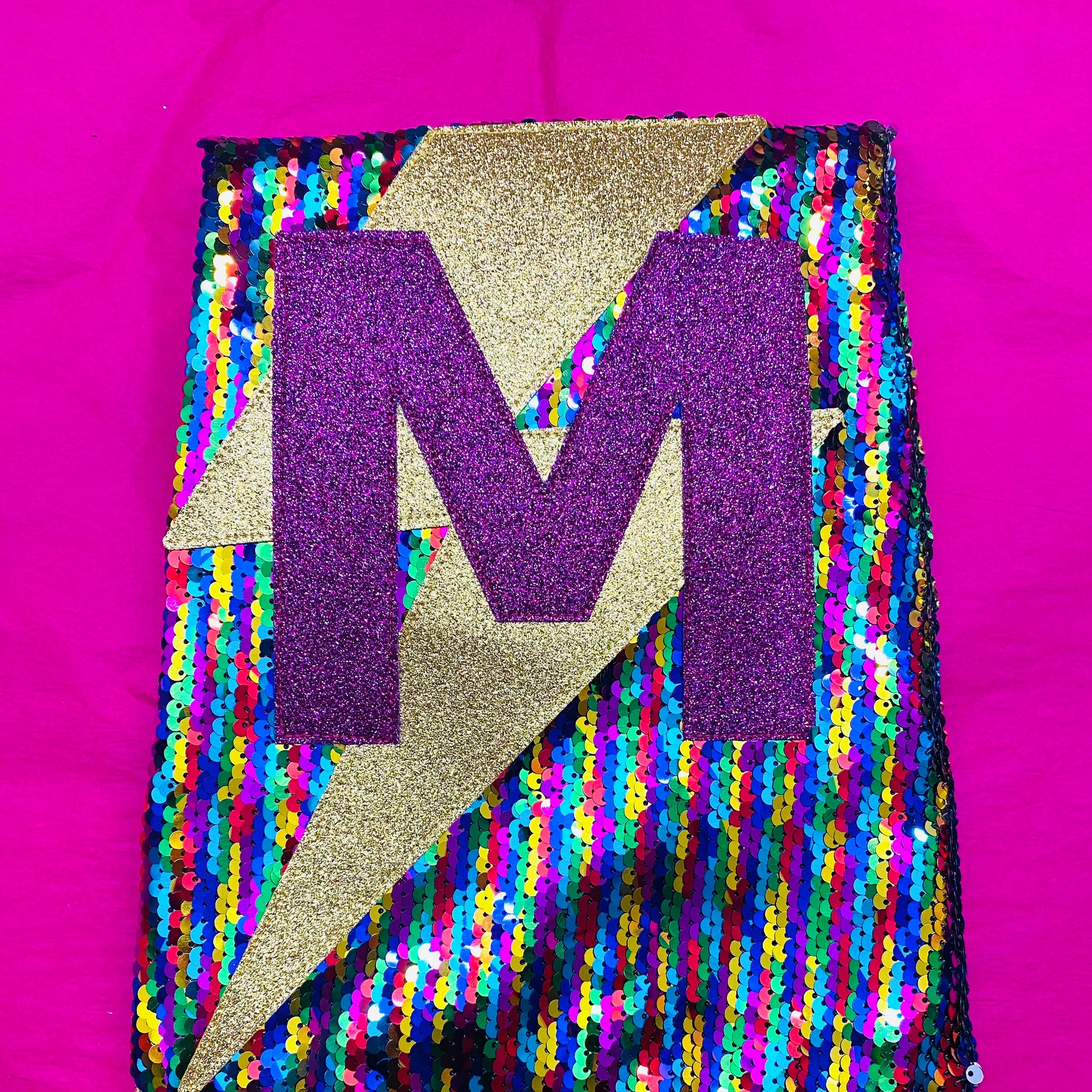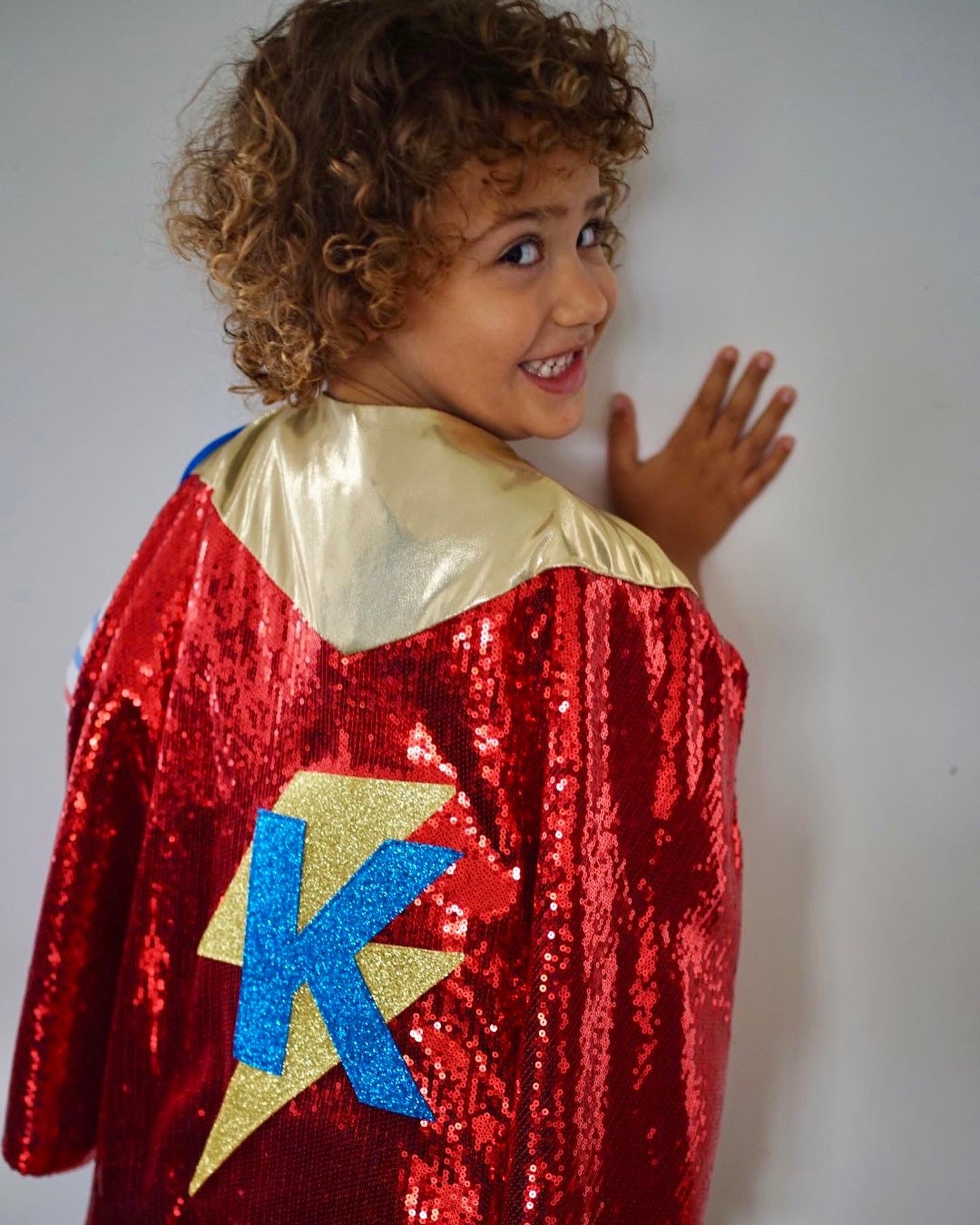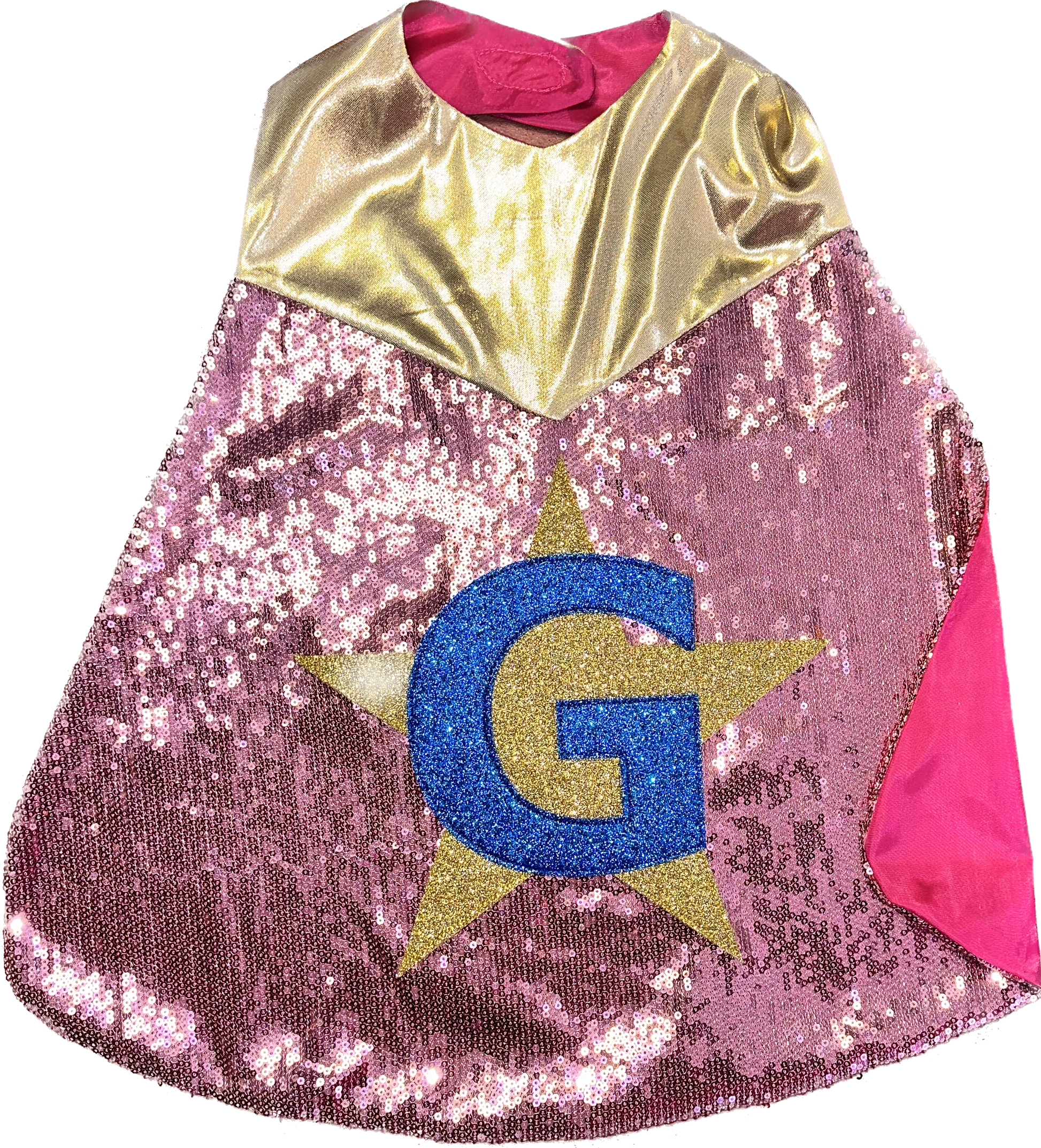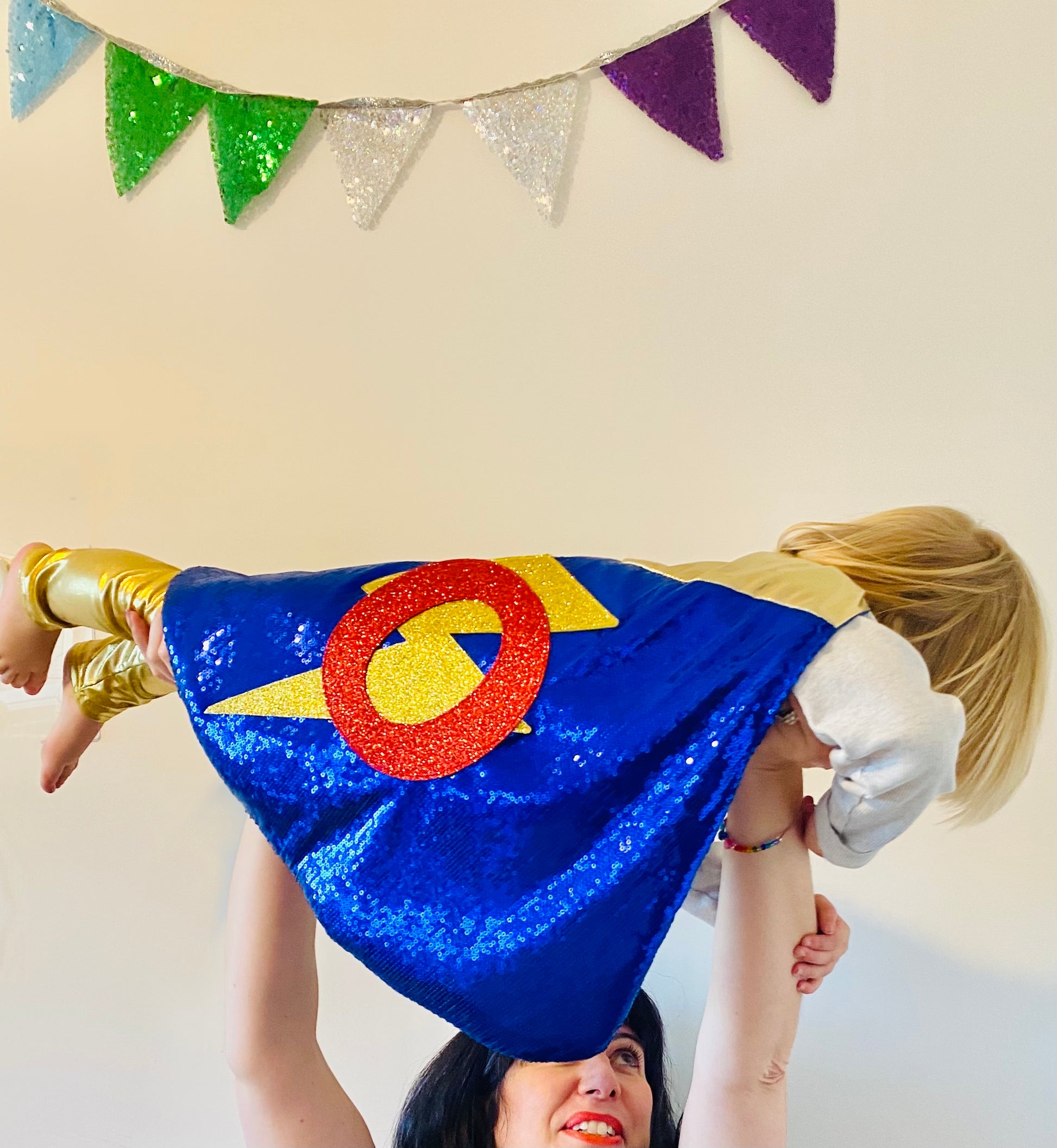 Our best selling customised cape, small, sparkly & mighty! Glistening sequins in your choice of colour, glitter lightening bolt & a stunningly sparkly initial