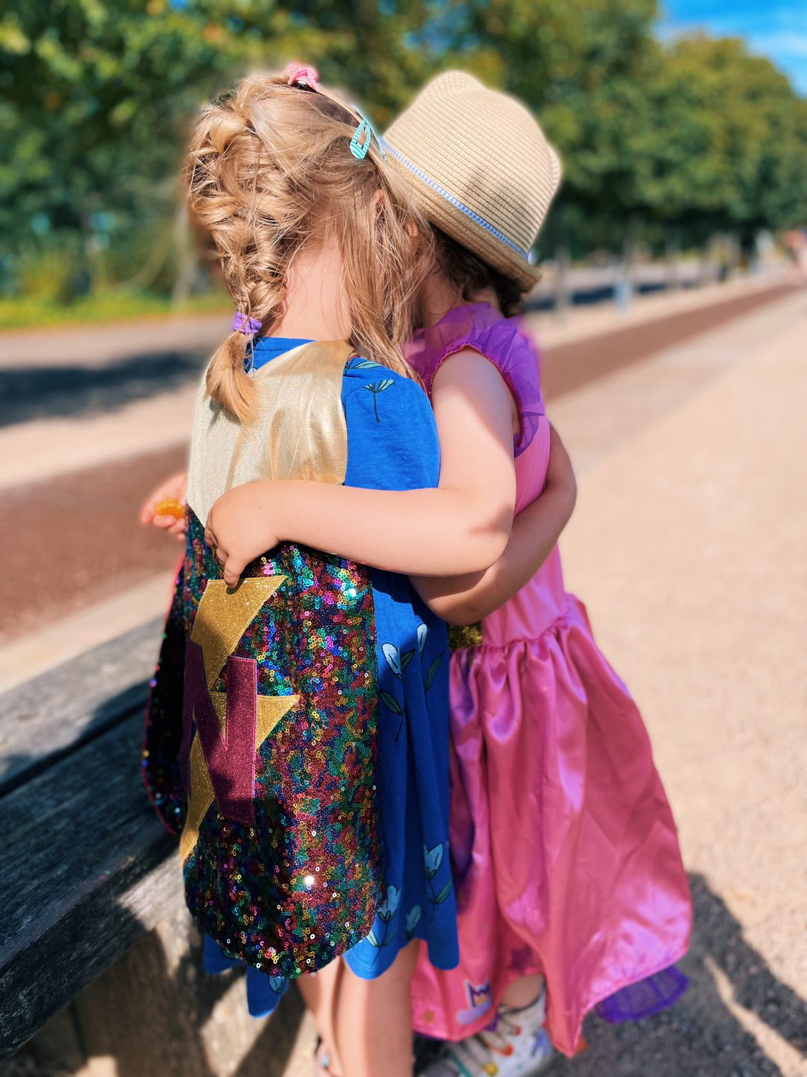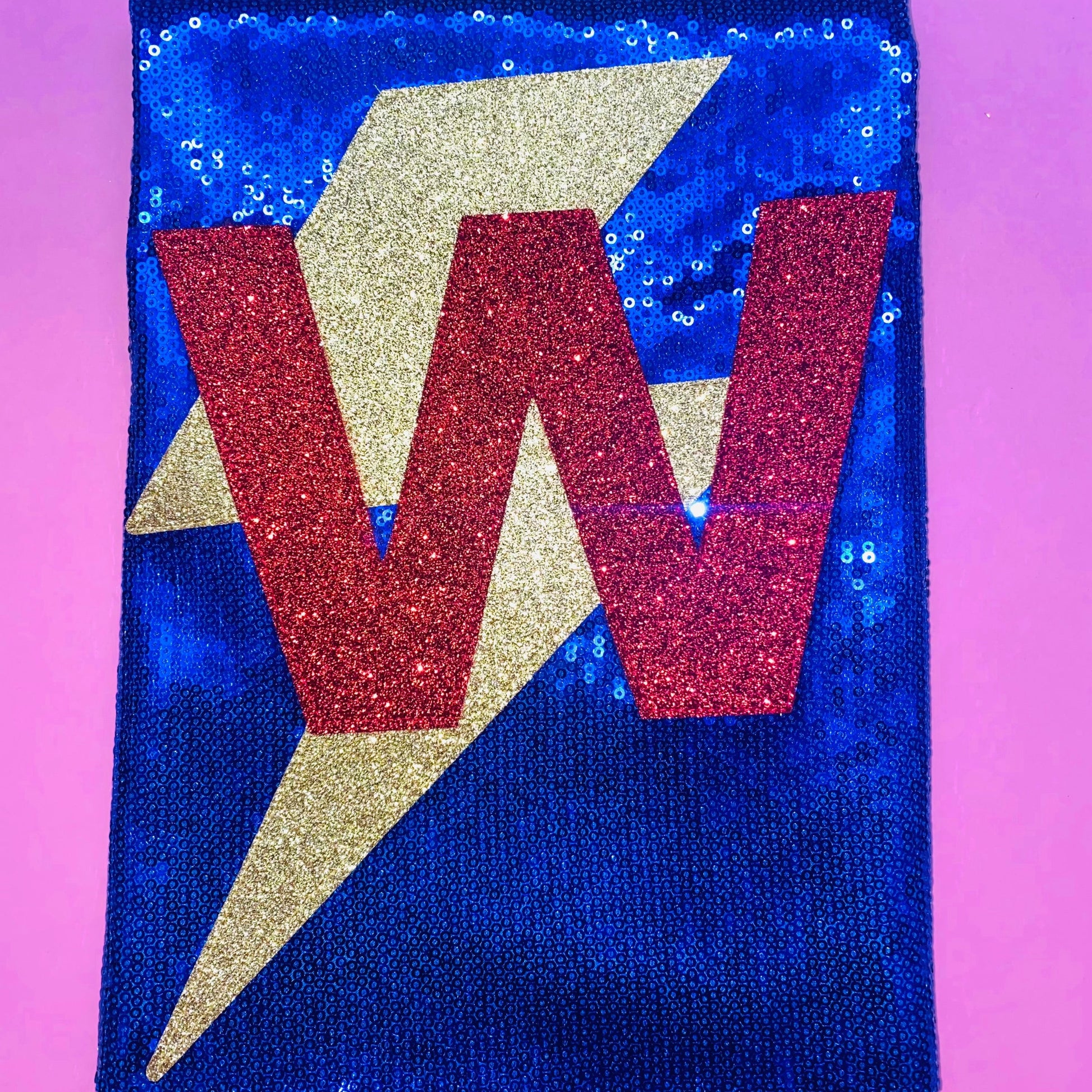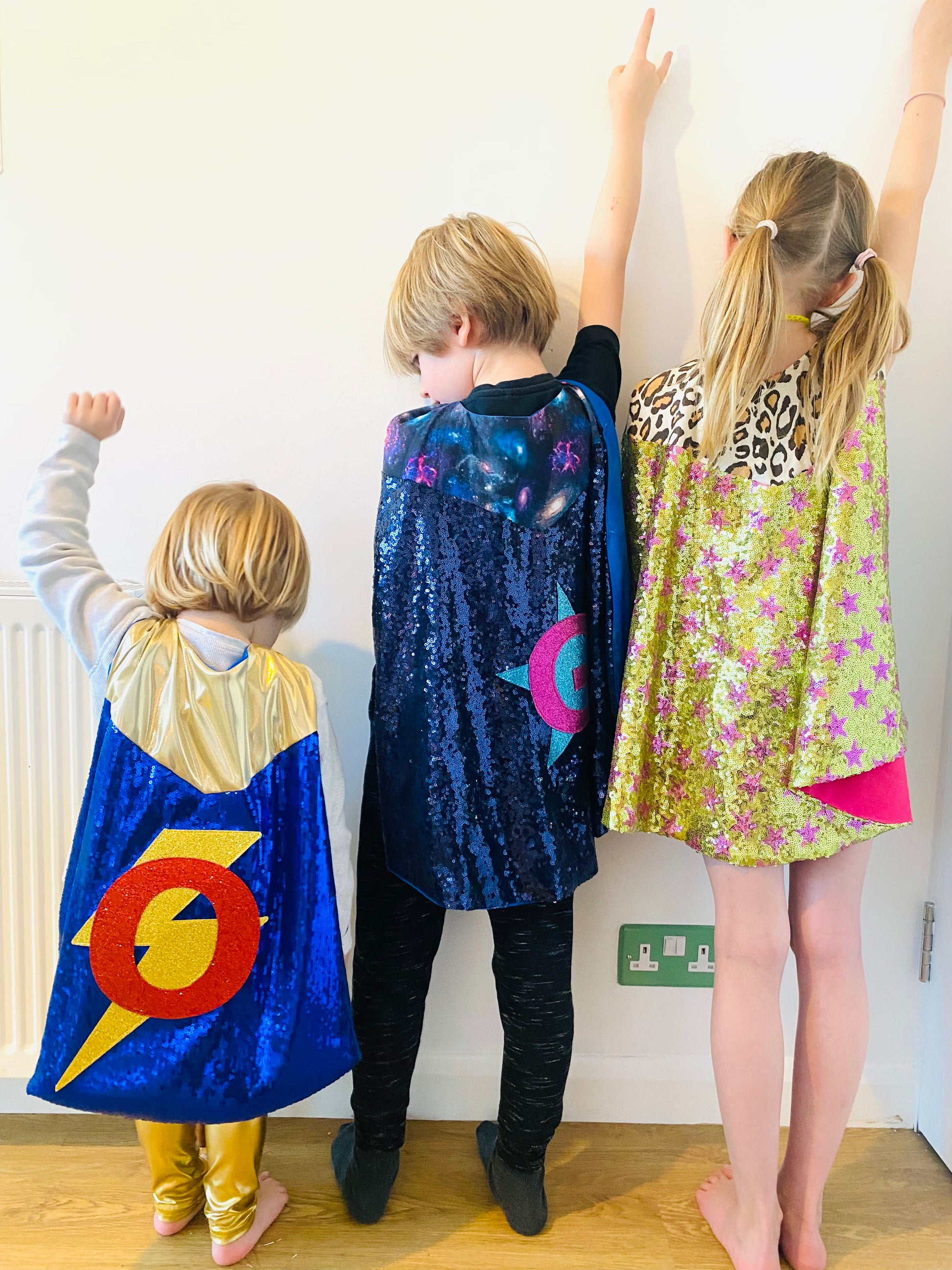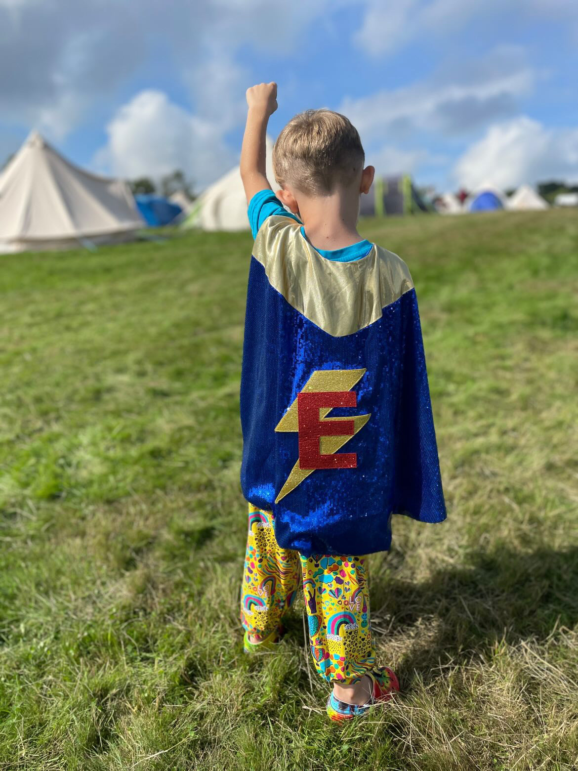 Our best selling customised cape, small, sparkly & mighty! Glistening sequins in your choice of colour, glitter lightening bolt & a stunningly sparkly initial