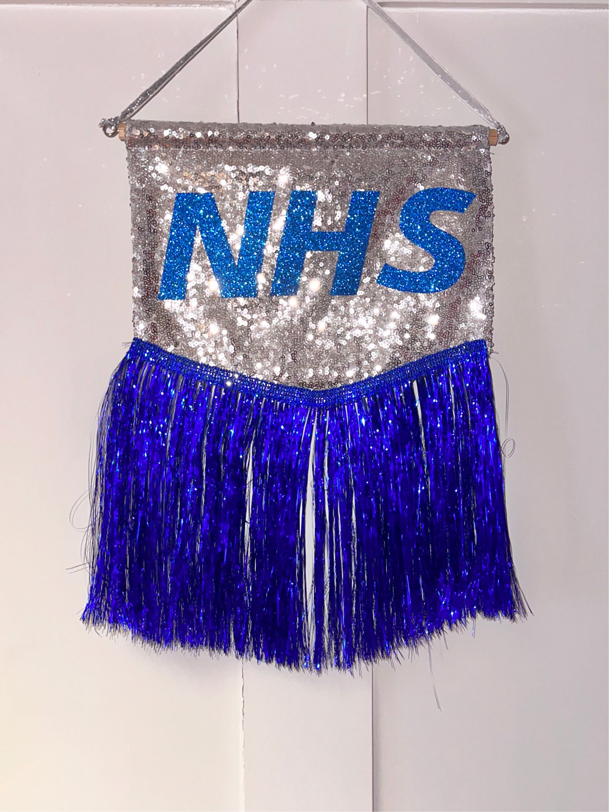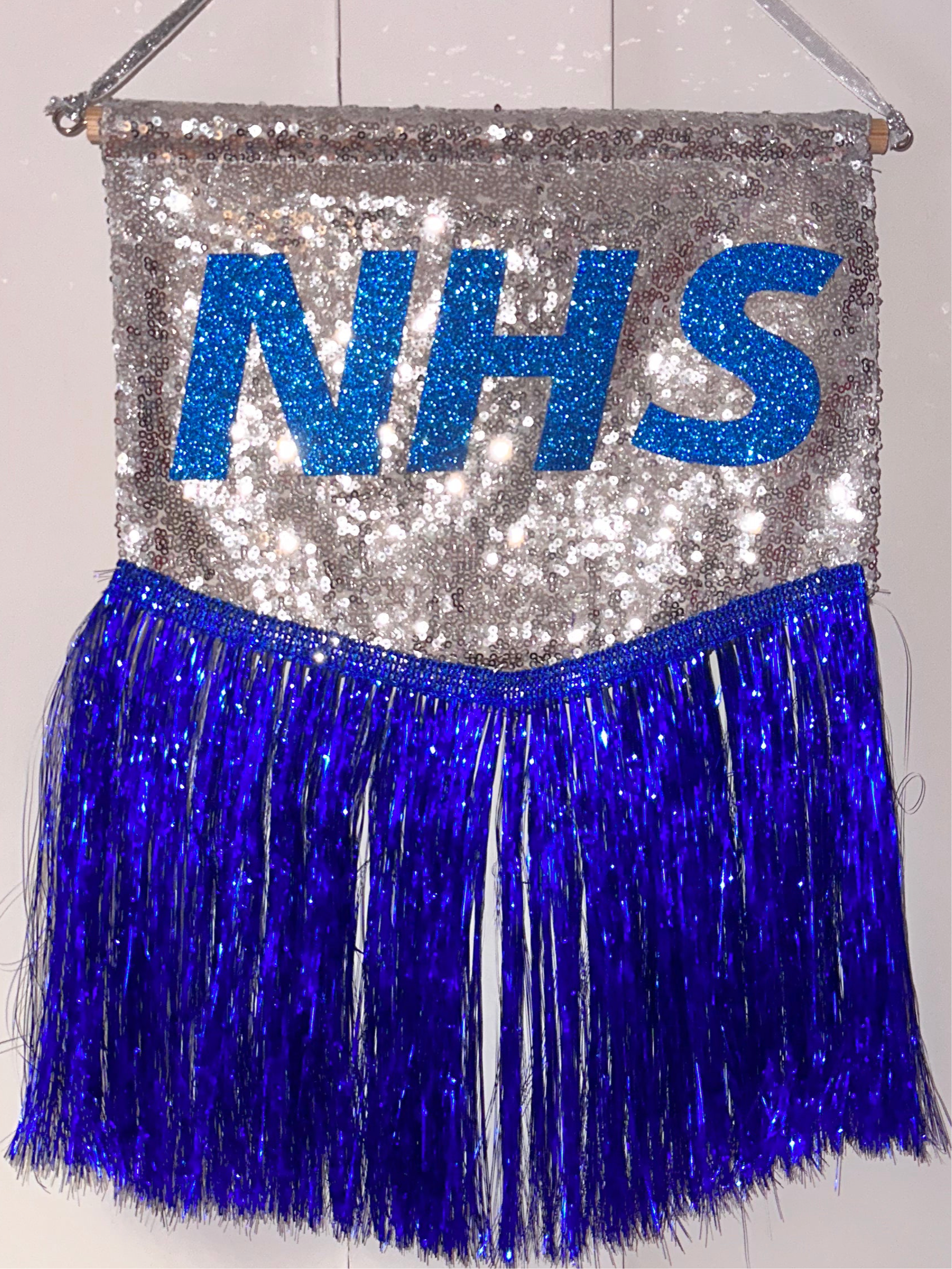 Super cute and super sparkly 'NHS' tiny banner, perfect to catch the light and add sparkle to any space. Silver sequins, blue coloured glitter writing, trimmed with blue tinsel. Mounted onto a wooden dowel and hangs with gold lurex ribbon.