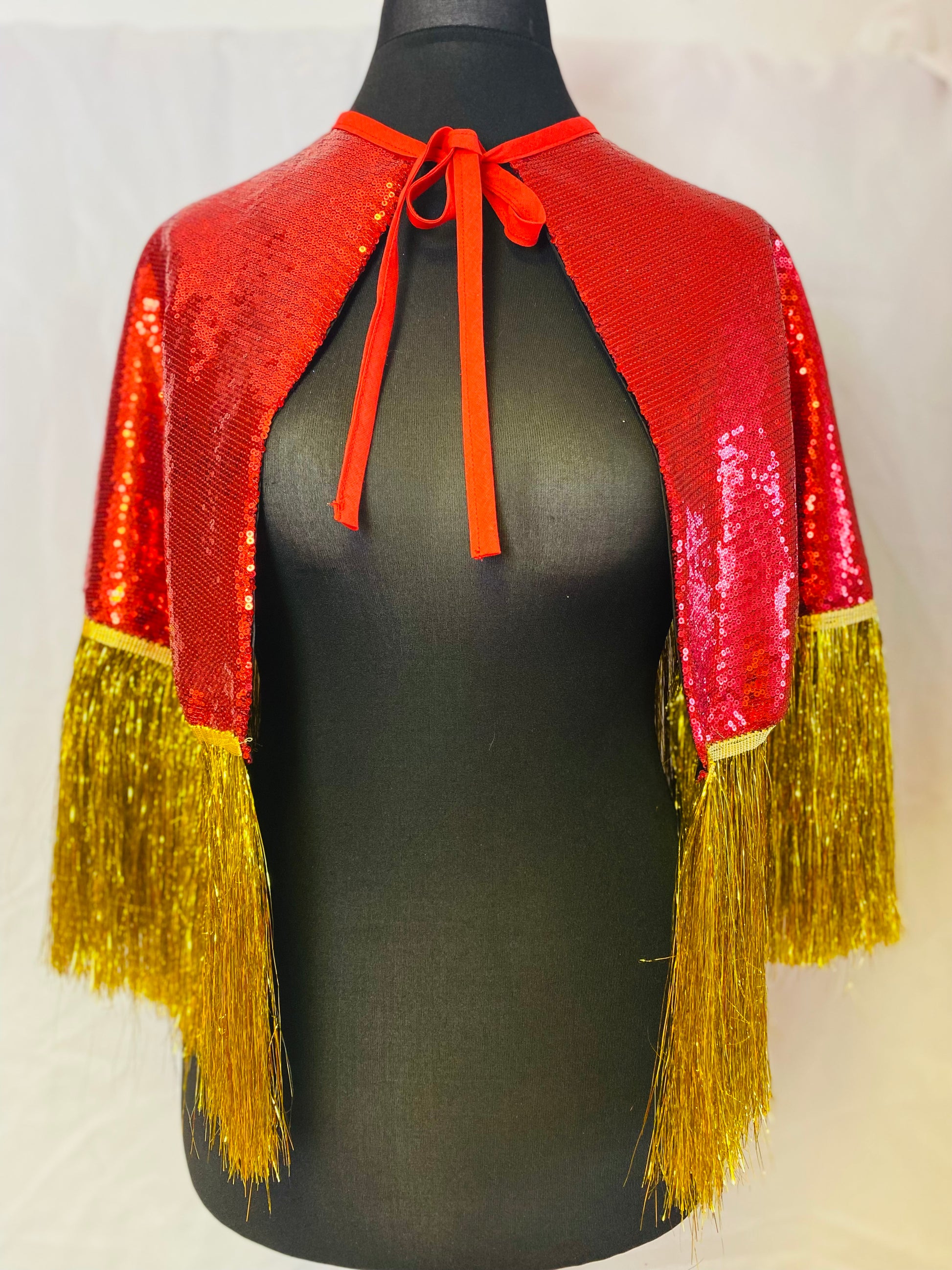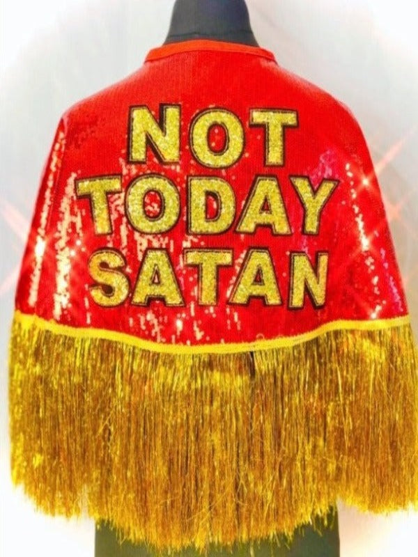 The Not Today Satan cape is created using densely packed sequins, glitter writing, it’s fully lined and trimmed with the sparkliest of tinsel.