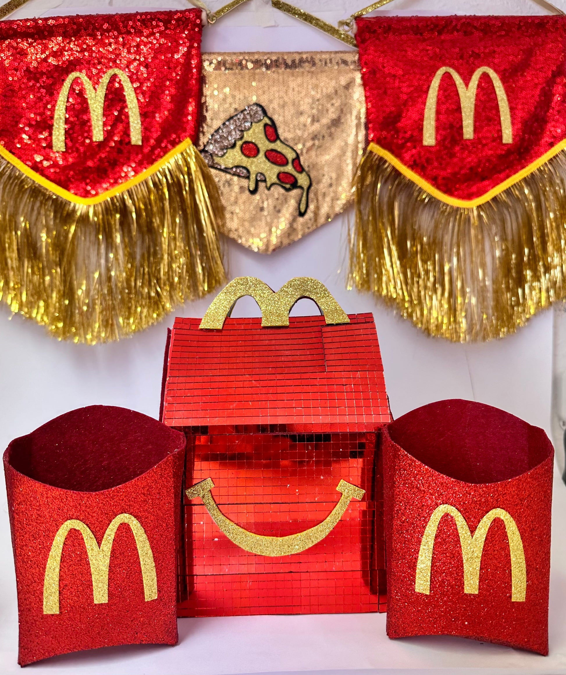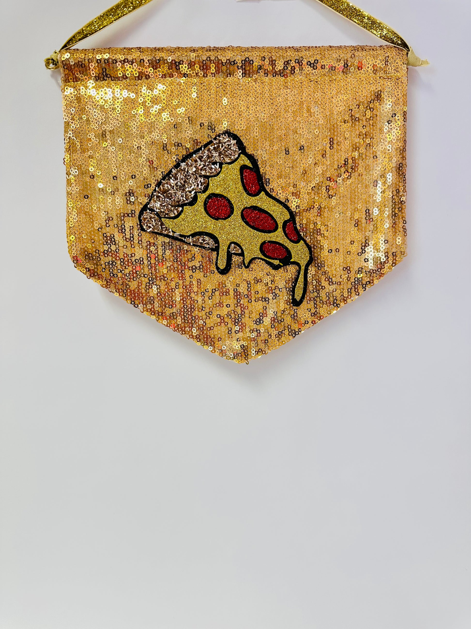 Gold sequins with a Pizza motif made from glitter.