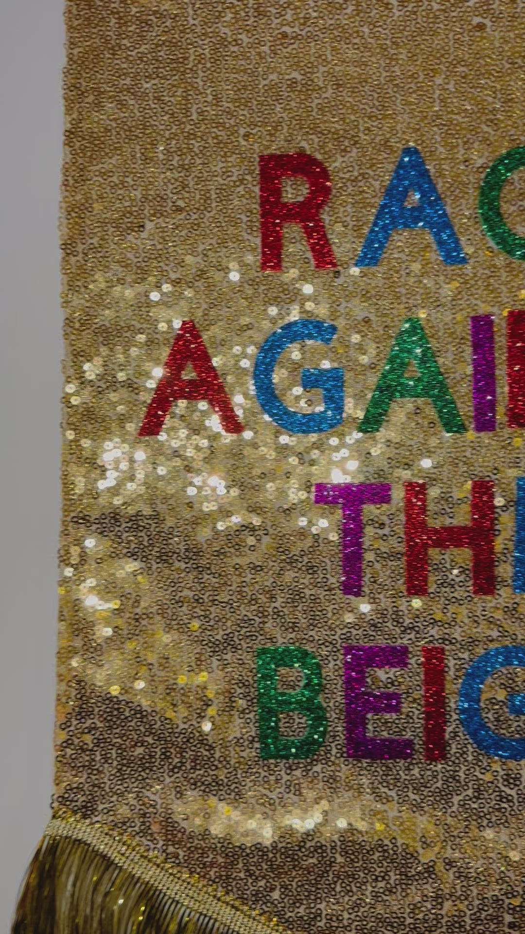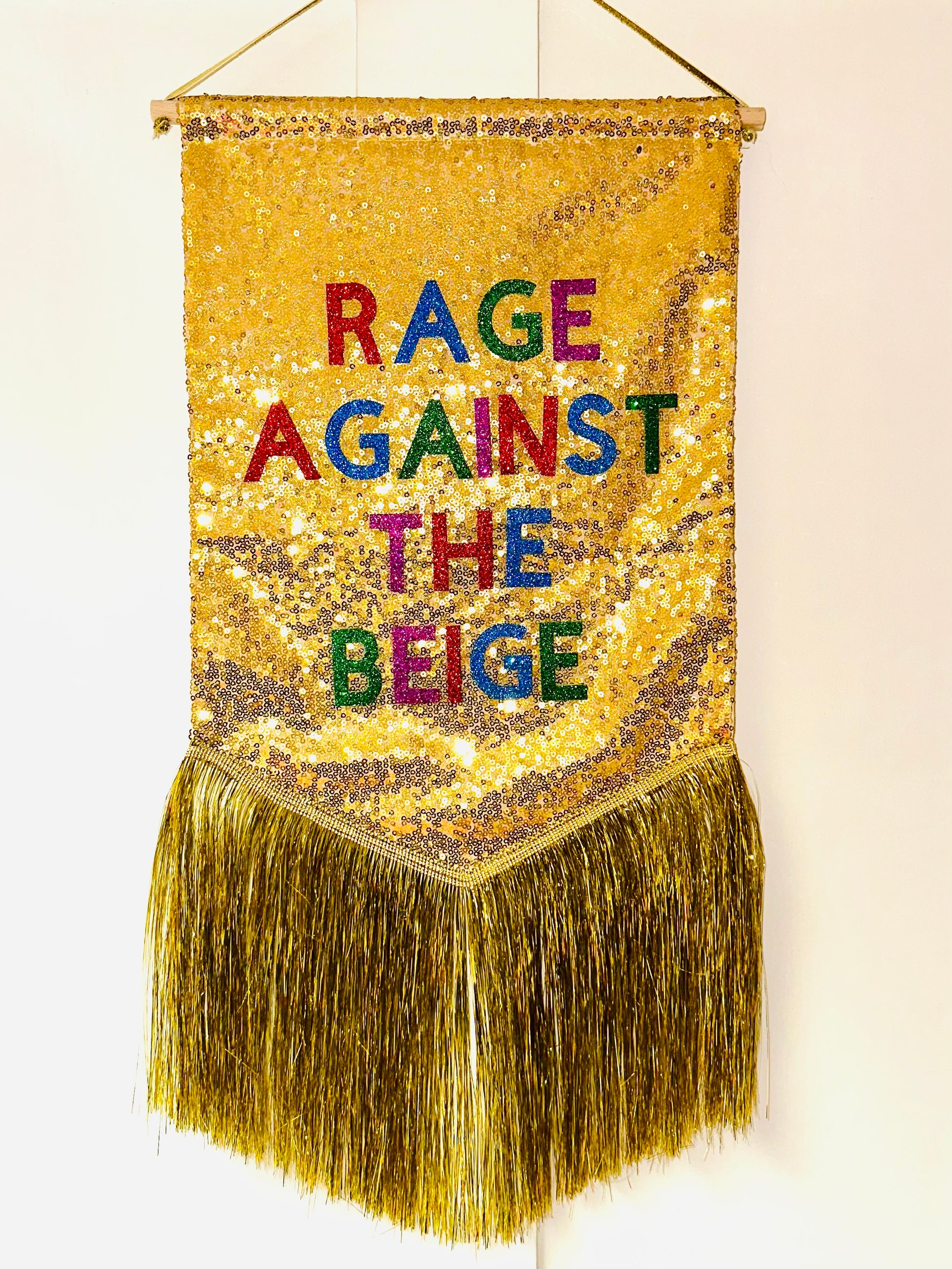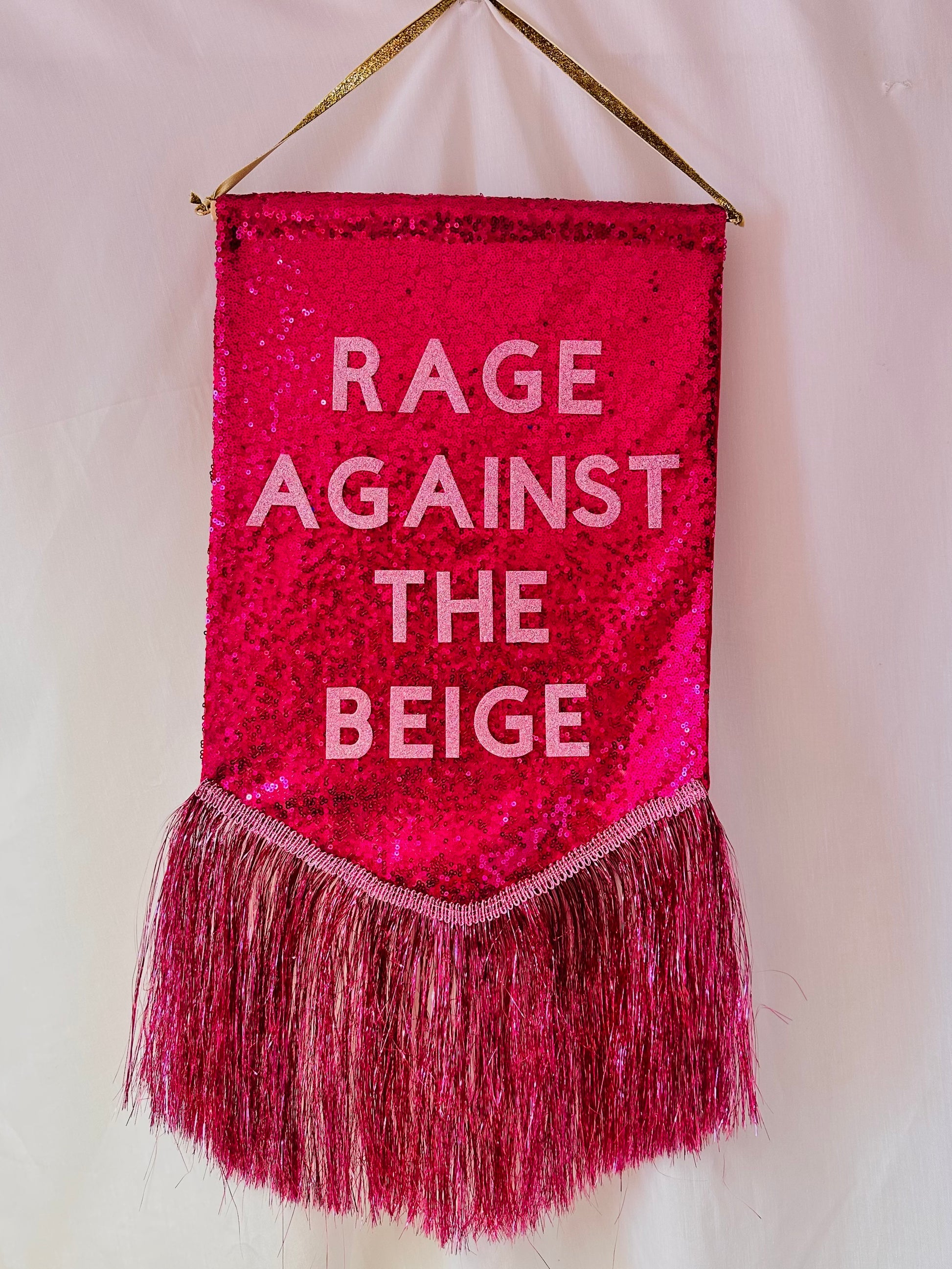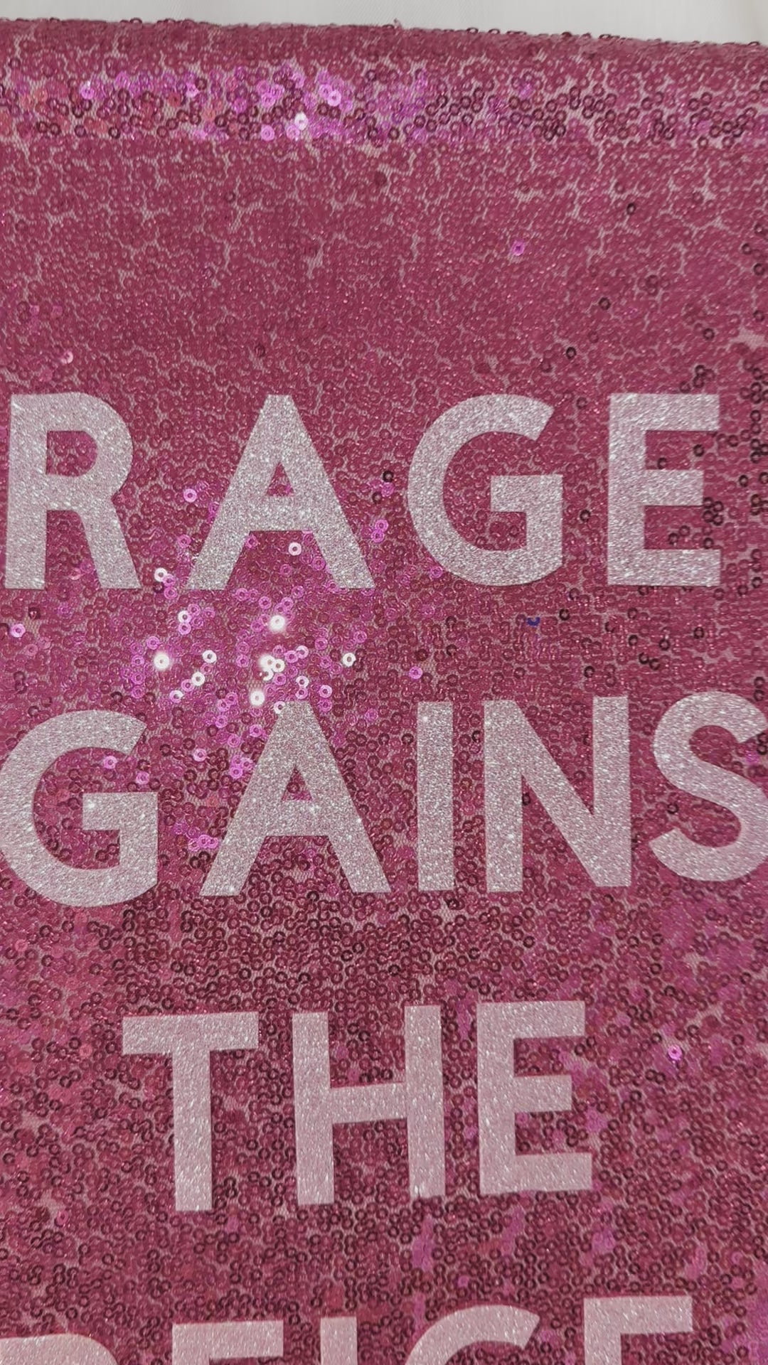 Pink sequins with darker pink writing and trimmed with pink tinsel