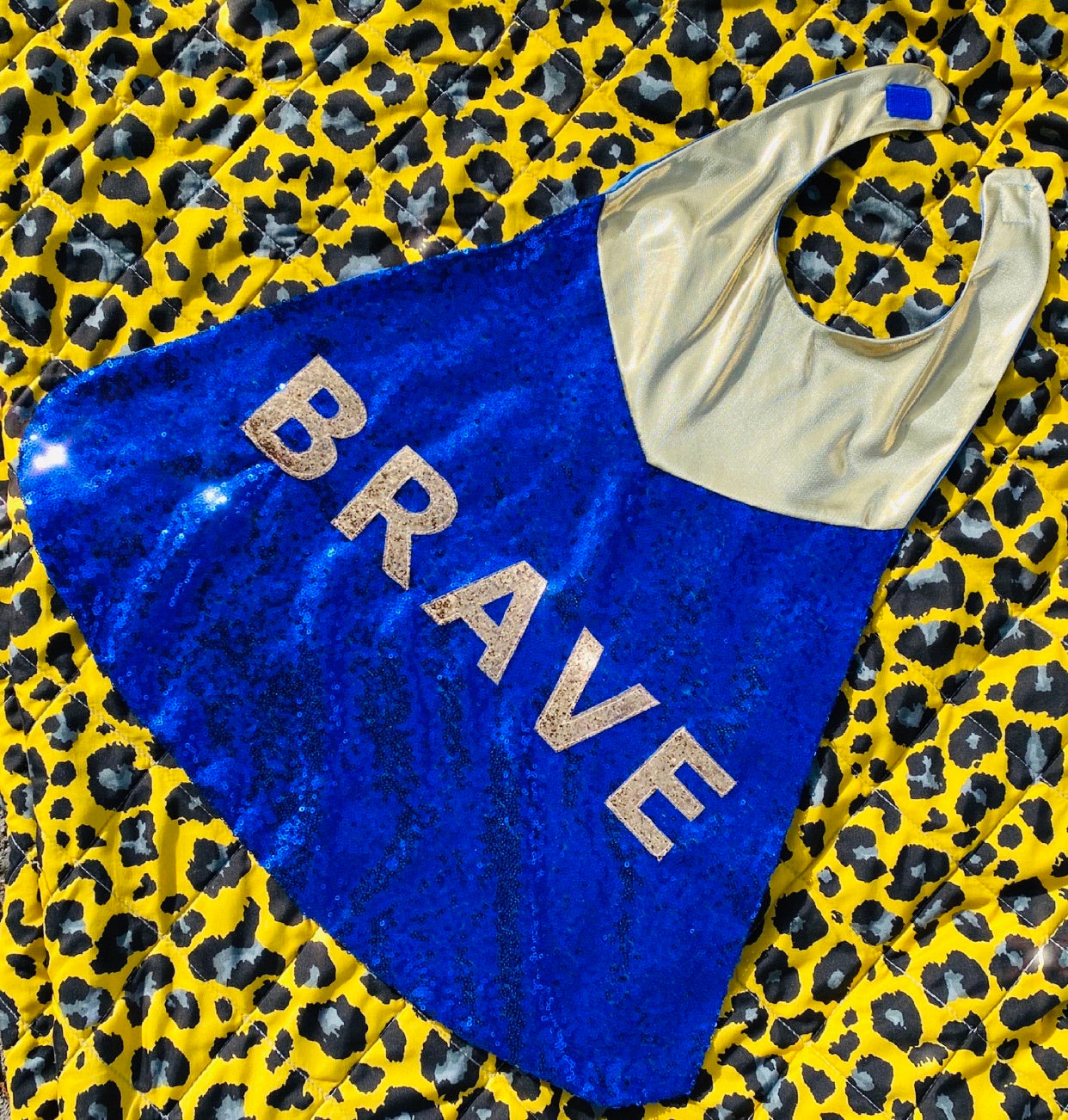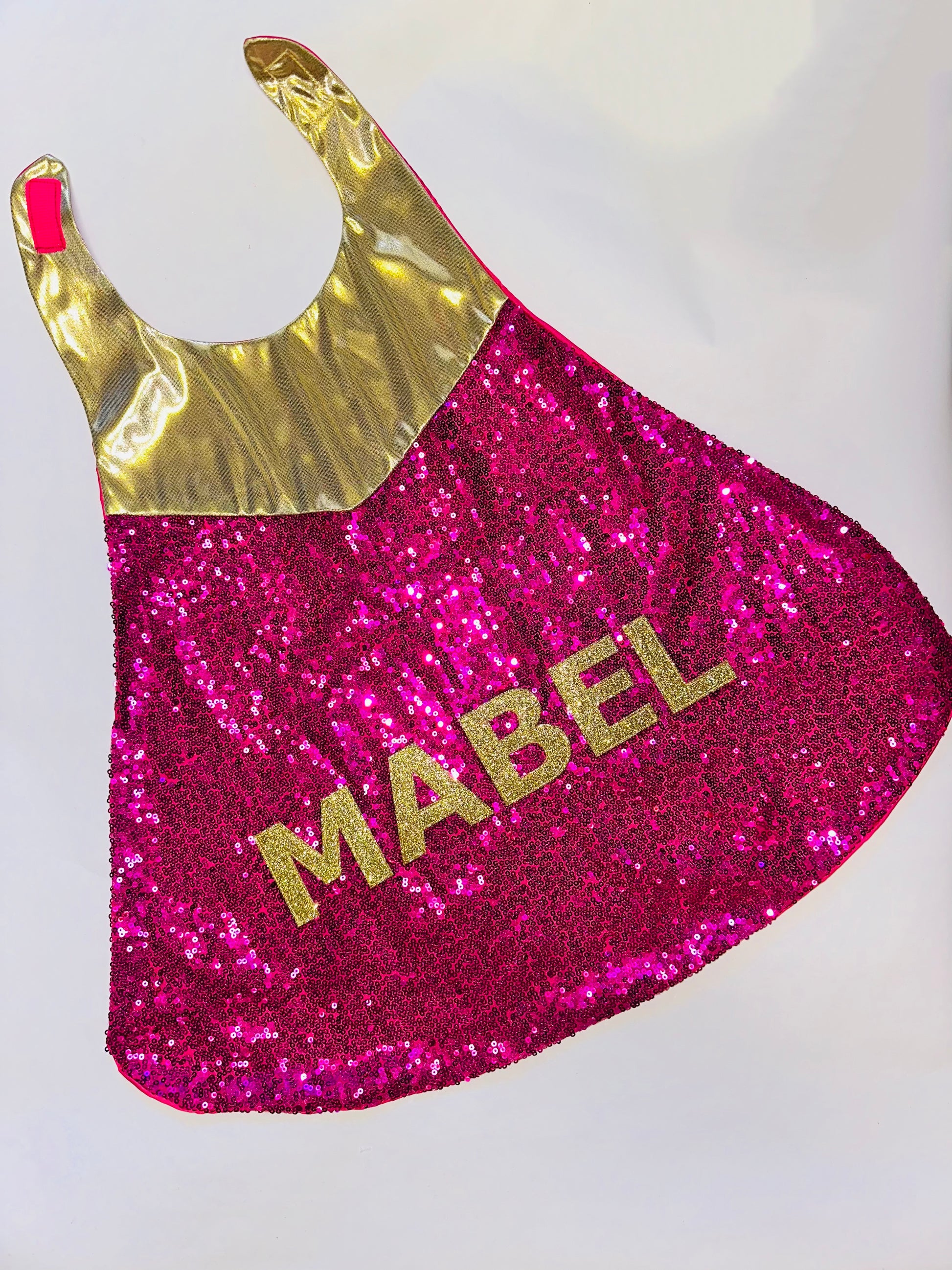A hero cape available in all sizes you can choose up to EIGHT letters to have a word OR name written in glitter on the back