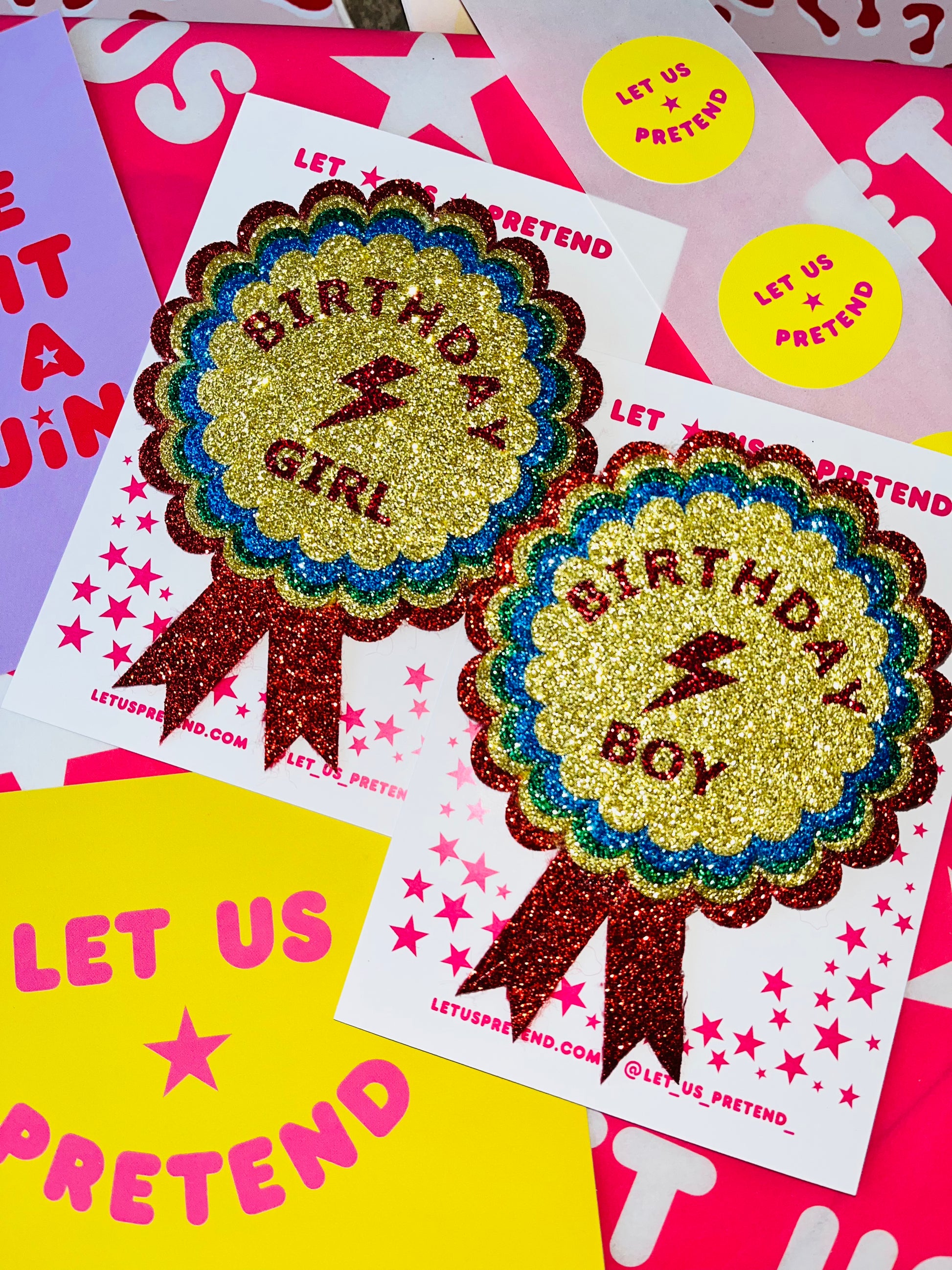 They are mounted on glitter and have a scalloped edge to represent the rainbow and come with the signature Let Us Pretend lightening bolt. Each badge measure approximately 10cm an comes with a brooch pin. All badges are beautifully gift wrapped and come with tissue paper and branded stickers so can also act as a perfect alternative to a birthday card. We can add a birthday note if you like too. Just add the note in the box and we'll make sure it arrives with one!