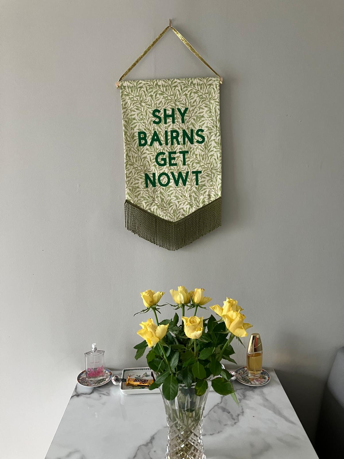 Green flocked letters printed in William Morris Willow Bough fabric with dark green traditional tassels.