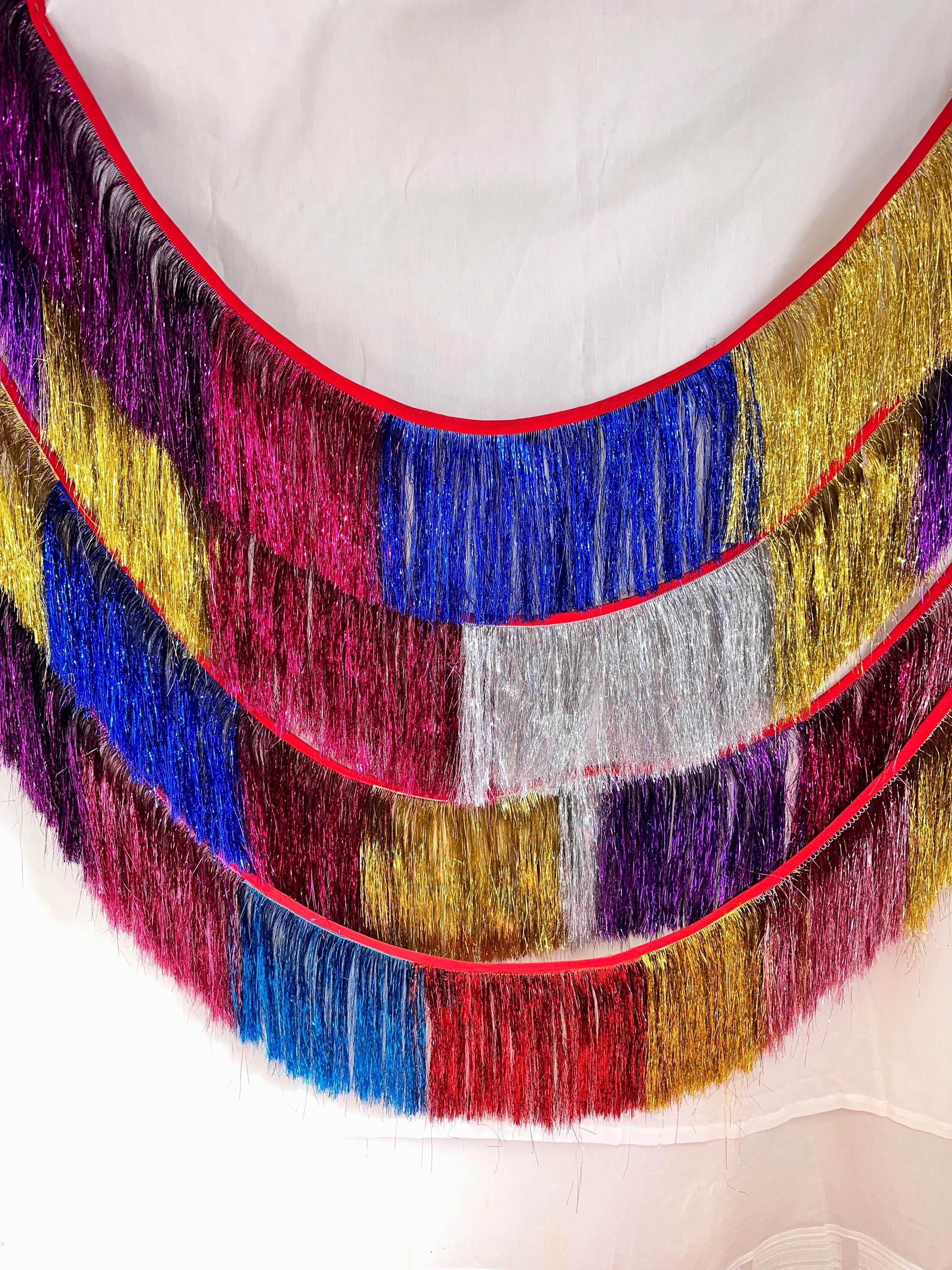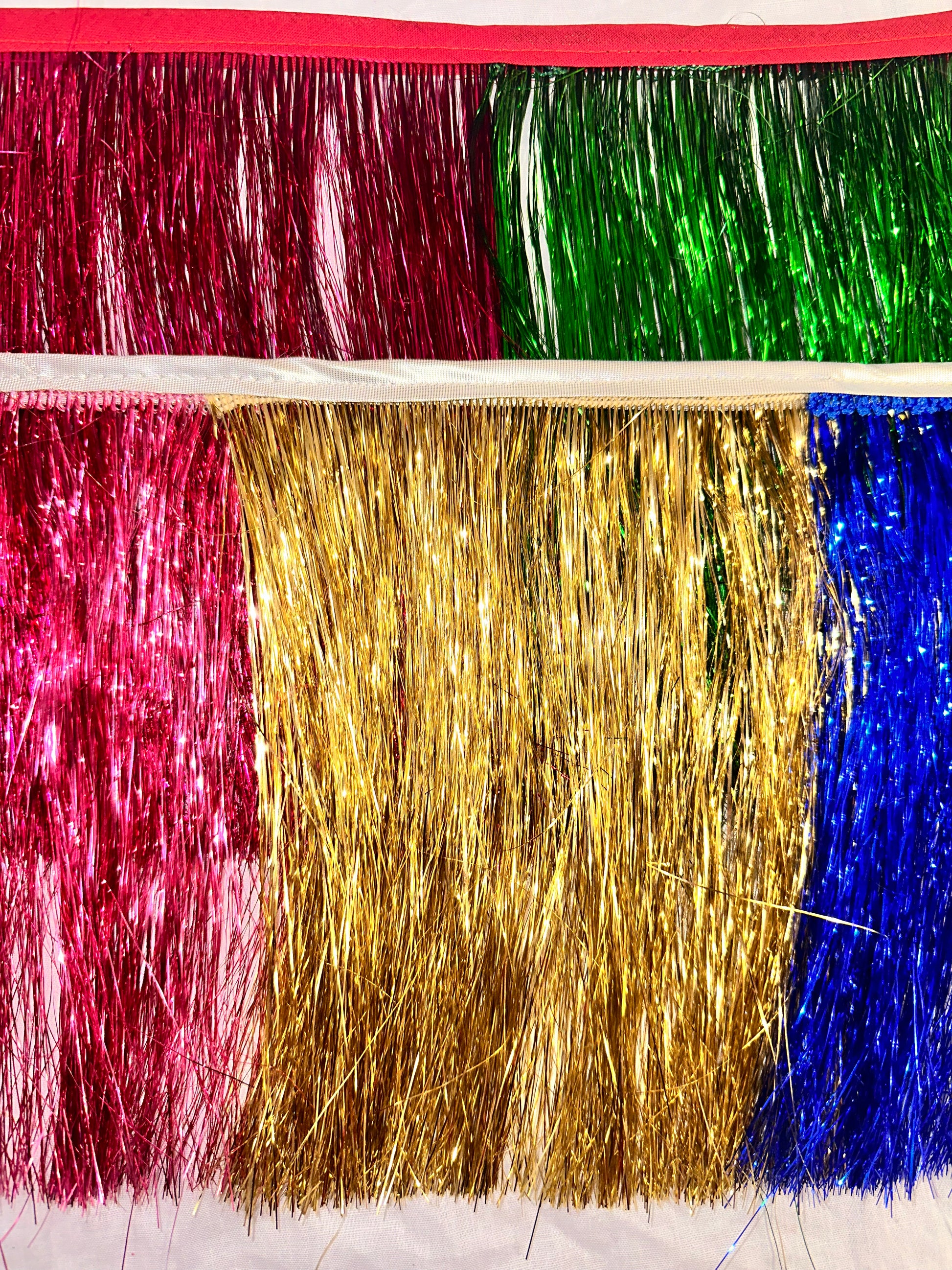 These beautiful garlands are made from off cuts of capes and banner tinsel. They are randomly placed pieces of tinsel in a mixture of gold, silver, hot pink, green, purple. You will get a mixture of an array of these colours. This is an effort to reduce, reuse and recycle. Please only order if you fully accept that the colour placement is totally random.